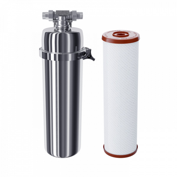 Мощный магистральный фильтр из нержавеющей стали с удобным креплением. Глубоко очищает всю воду в квартире, не снижая напор в системе.